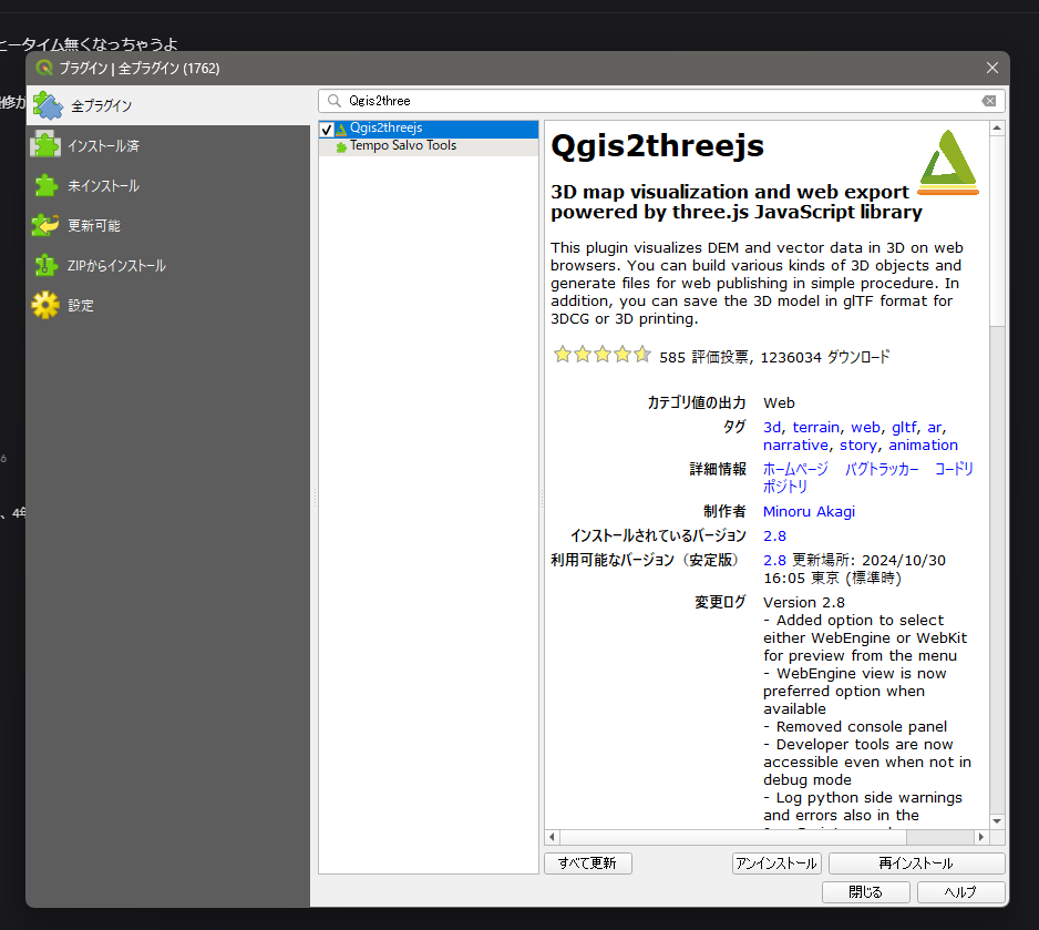 4. 「全プラグイン」タブ内右上の検索欄で「Qgis2threejs」を入力し,Qgis2threejsをインストールする(下画像はインストール済)