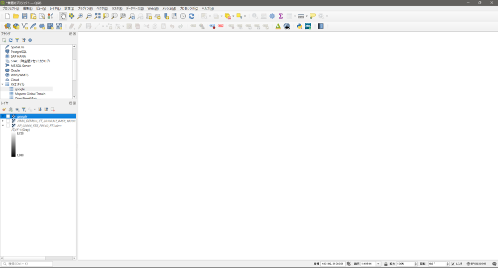 2.QGISで新規プロジェクトを開始すると,以下のような画面構成が出る.